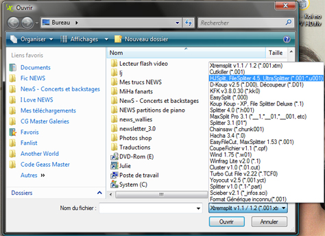 2. Sélectionnez "Coller" au lieu de "Couper". Puis cliquez sur le bouton "S" pour sélectionner les fichiers. Avant toute chose, n'oubliez pas de choisir le bon format de fichier, en bas à droite ; la plupart du temps, les fichiers auront été découpés avec HJSplit, trouvez-le donc dans les différents formats proposés (format sélectionné sur le screen ci-dessous). Par contre, un seul fichier vous apparaîtra : celui en .001. C'est normal. Sélectionnez-le, et le programme se chargera lui-même de détecter les autres parties. S'il en manque une, il le verra au moment de l'étape ci-dessous et vous le signalera.